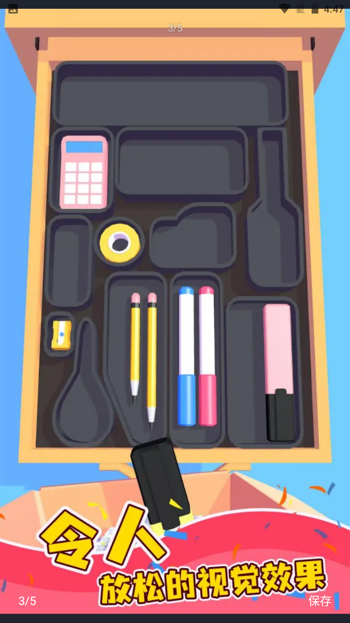1、竖屏轻松游玩:游戏采用竖屏单手操作,轻松拖拽物品进行分类与摆放,碎片时间也能畅玩;