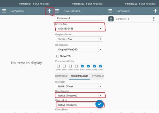 2、在导入游戏之前我们需要创建一个容器,通过首页点击“+”创建,然后选项设置,这里需要根据你要导入的游戏来设置,例如分辨率大小、Direct sound 和 Direct Music等,确保导入游戏后画面大小正常、背景音乐流畅运行;