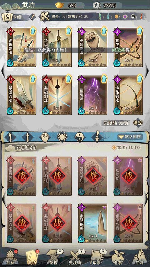 而武功需要我们去藏经阁去进行探索获得,里面有几率可以抽取到非常强力的武功,小编更推荐大家前期先屯着自己的元宝和高级武功券,因为前期系统给予我们的武功就可以应对很多关卡了,等有了很多高级武功券和元宝的时候再进行抽取武功,然后根据自己第一个抽出的金色武功的派系再对自己的武功组合进行修改,这样可以极大程度的提高大家的战斗力和可玩性。
