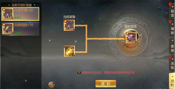 玩家的手镯和戒指可以通过在寻宝获得的进阶石在改界面对装备进行进阶