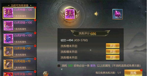 每件装备有4个洗练槽,可花费元宝开启更多的洗练槽