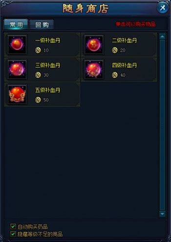 点击背包界面中的【商店】按钮,可以进入上图所示的个人的随身商店,玩家可在其中购买常用的道具。
