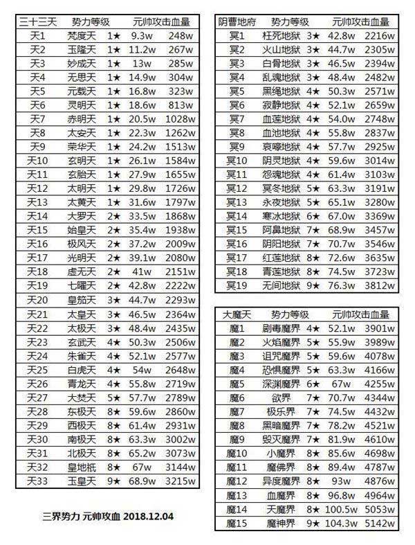如果当前界主是空位,那么需要打败npc士官和界主即可获得征服度,三界全部npc界主的属性如下图所示,只有攻击和血量,防御统一为0,没有真伤。