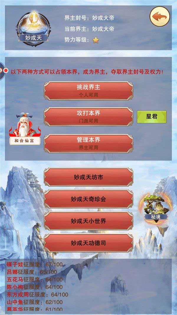 在凡间之上有三界,即33天界,19地狱,15魔界共67个小世界,每一小世界都有自己的界主,世界也有星级,所有玩家皆可参与界主争夺,挑战胜利即可获得征服度,征服读满值才能成为界主,界主进度=世界星级×100,例如,一星梵度天的需要100进度,九星玉皇天需要900进度。