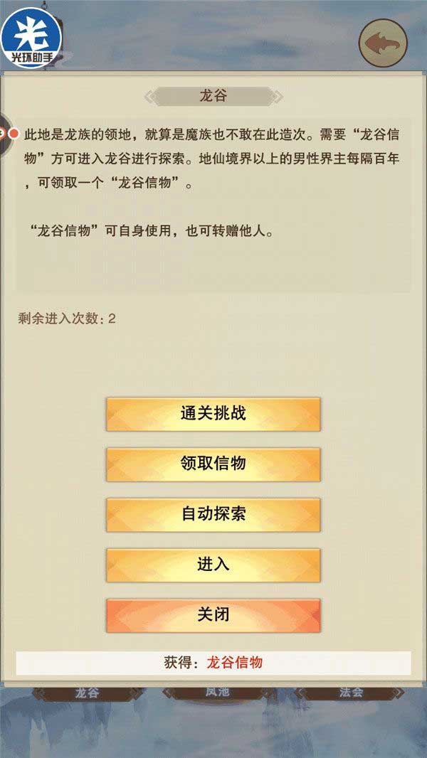 男性界主能领取“龙谷”信物,女性界主能领取“凤池”信物,该信物是进入龙谷或者凤池的门票。每天能领取一次,如果忘记领取,则次数作废,不会有补偿。