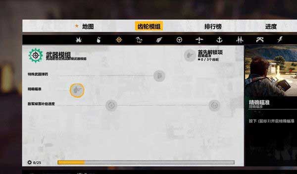 4、当我们升级后,会发现原本的,精准瞄准,已经亮起了绿色,这就说明我们已经升级成功了,并且我们解锁了相应的动作,