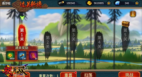 玩家进入过关斩将玩法后,可点击闯关进行挑战,挑战胜利后此关通过。 每日玩家可以手动重置一次,重置挑战进度。 玩家可以使用扫荡功能,扫荡之前已通关的关卡直接获得奖励。