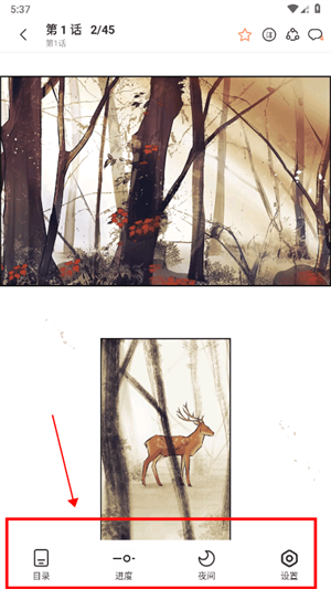 在阅读页,提供目录、进度、夜间、设置等功能;