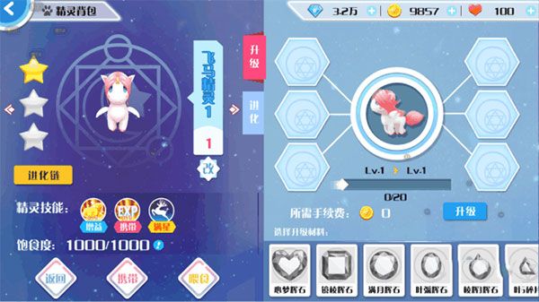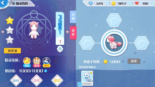 进化:在上述精灵养成界面选择进化页签,即可让精灵进化升星。每升一星精灵的外貌都会发生变化哦!一星精灵升2星需要10级,还需要三只一星精灵作为素材;二星精灵升3星需要20级以上,还需要另外三只二星精灵作为素材。