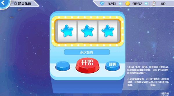 精灵乐透:点击开始按钮机器开始转动,如果停下来时三个图案一致,则可以获得精灵碎片。