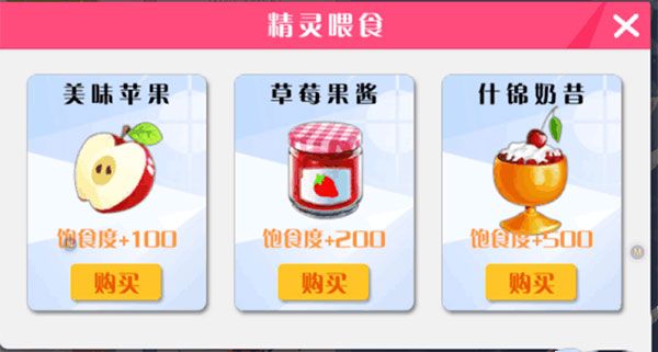 喂食:在精灵养成界面选中你想要喂食的精灵,购买或使用三种食物之一,使用后精灵会回复相应饱食度,饱食度关系到精灵携带技能的触发,饱食度为0时携带技能就无法发动,因此要记得时常给精灵喂食!