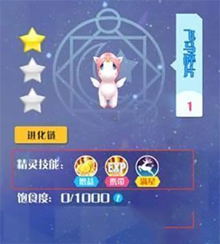 增益技能:精灵在被携带时,每分钟会一定几率给玩家一些金币、体力、经验、礼包等的奖励,当饱食度为0时则不触发增益技能。
