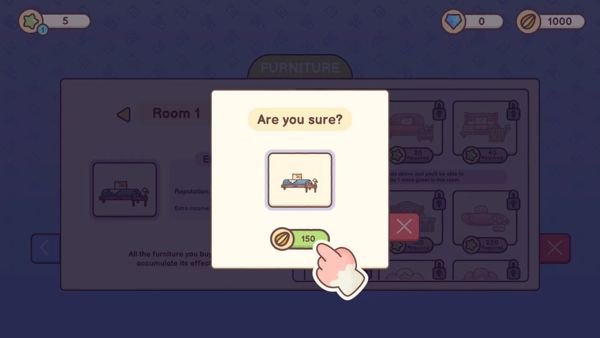 1、设施和服务因客房而异,完成经营的挑战任务,包括基本客房和仅限宠物入住的客房,购买新的房间。