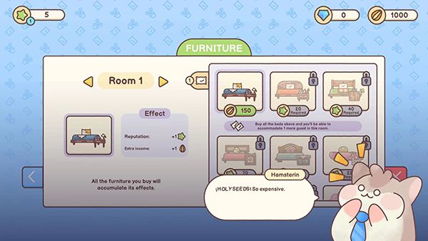 提供了丰富多样的房间和家具供玩家使用。玩家可以自由设计和布置旅馆的房间,包括客房、休息区、餐厅等,通过合理搭配和装饰,打造出独具特色的仓鼠旅馆。