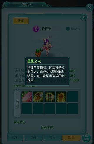 除了传统的宠物以外,还有一类宠物也是很推荐萌新带的,那就是珍兽。目前游戏中能够获得的珍兽大概就是充值礼包里的玲珑兔了,随便充点值就立即送给你,简直so easy!玲珑兔的特点在于她的特殊技能“星星之火”,不仅伤害高还可以压制敌人,长得又超级萌,反正瑶瑶是喜欢得不行~