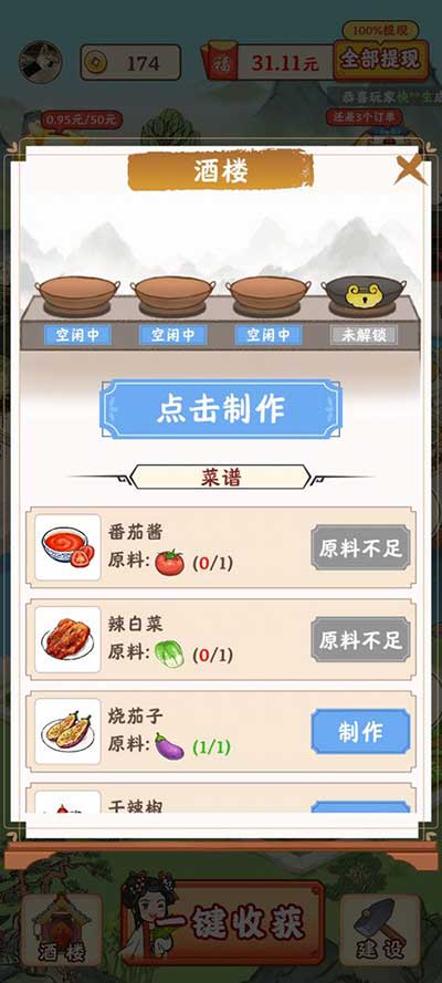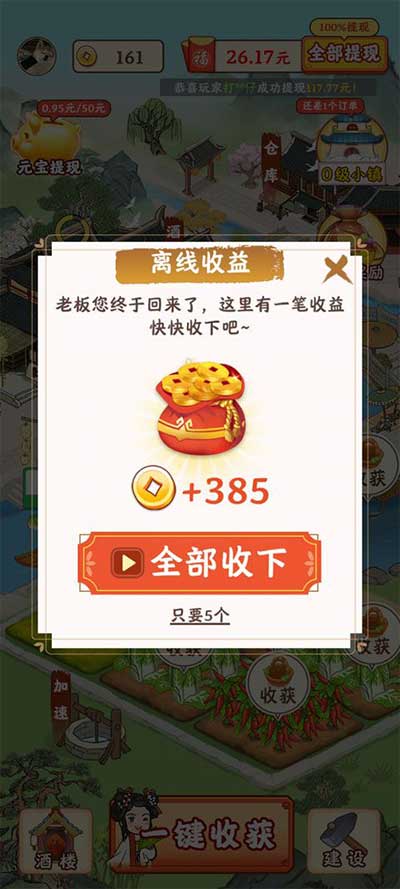 江南小镇官方正版是一款非常休闲的模拟经营手游,如画般美景中是你的良田小镇,在这里经营酒楼、招待八方来客,轻点手指就能种田,鱼粮满仓由你掌握,还有仙鹤衔礼而来,原来农田生活也能这么悠然自在。游戏的玩法非常简单,只要一键种植、养殖、收获等操作,就能快速完成订单,获取现金红包。当然除了种植、养殖之外,玩家还可以完成小船订单、经营酒楼生意、获取角色赠送的礼物等赚取现金红包,更有离线收益等你来拿。此外,你只要将你自己的小镇等级提高,酒店生意经营妥善,吸引更多的人来消费,就能铸就一片辉煌的小镇风情!喜欢这类游戏的玩家可以下载体验!