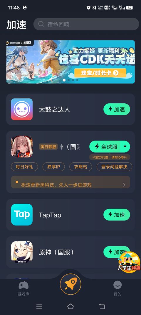 1、在本站下载安装太鼓达人官方版,然后打开奇游手游加速,找到该游戏,然后点击右侧加速;