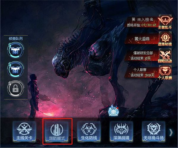 在冒险模式的战场界面中,点击“塔防模式”进入,关卡依然是原来的章节关卡。