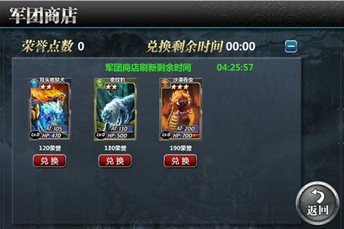 军团等级达到一定程度会开放军团商店。军团商店中,购买每张卡牌都需要消耗荣誉点。卡牌的星级或者等级越高,所需要的荣誉点也会越多。