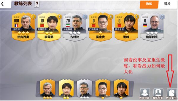 所有资源全部升级热内西奥。委任热内西奥为主教练,其他4个挨个尝试其他职位,哪个加成高,就给委任哪个职位。