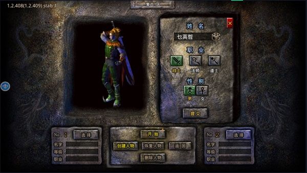 首次进入就是角色创建界面,随机选择或输入昵称。当昵称符合规范且未被他人注册时,才可以使用。可以选择职业和性别,点击“提交”开始游戏: