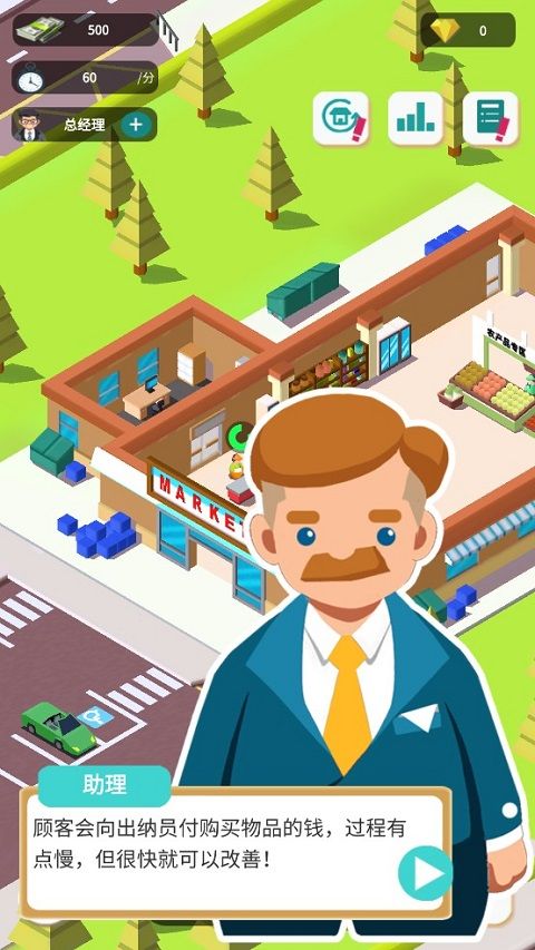 2、剪彩完成后,你便可独自经营这家超市啦。游戏玩法其实非常简单,营业期间顾客会自动抵达停车场,接下来让我们熟悉一下购物流程!