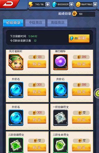 巅峰勋章可以在商店中兑换各种稀有道具,包括金色的英雄碎片,商店分为初级商店、中级商店、高级商店,中级商店和高级商店需要达到一定的档位才能开启。