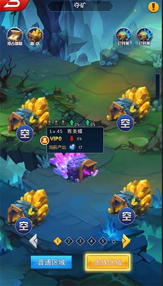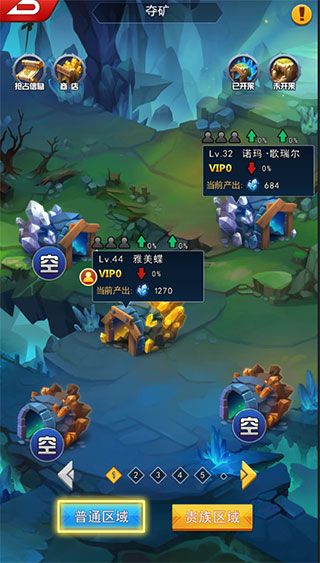 矿脉分为普通区域和贵族区域。每个人只能同时占领1个矿脉。贵族区域跟普通区域矿脉的品质有差距,占领需要消耗体力和钻石不同。非VIP玩家也可以占领贵族区域。