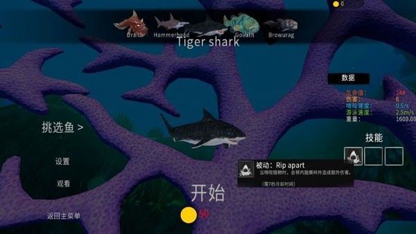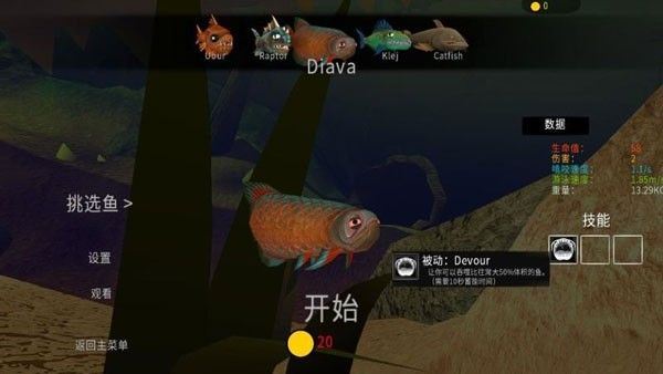 技能:拉帮结派(召唤周边的鱼类,成为你的同伴);毁灭(吞下比往常大50%的肉块)