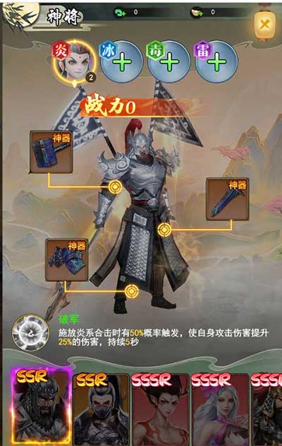 Sr以上品质的每位神将都有自己独有的神器,激活这些神器可以获得战力的提升,神器可以升级,升级提升属性。集齐一套神器还会获得一个特殊增益,使接下来的战斗更加顺畅。