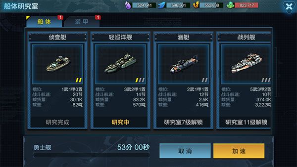 船体研究室内可以研究解锁船体、装甲用以军舰建造时选择搭配,越高级的科技研究会消耗更多时间跟资源,保证自己充足的资源是关键。