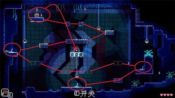 往左走,在下图区域内依次启动开关,最后往中间跳拿到宝箱内的蛋。