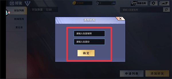 3、然后将玩家昵称、ID输入后点击确定即可添加,添加后需要等好友同意申请才能一起玩哦