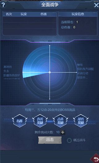 10级解锁,随等级开放更多的战舰挑战,挑战任意战舰可立即获得一份固定奖励,初始挑战次数为10次,随时间进行恢复次数,战舰被击败后,参与挑战的玩家根据累计伤害进行排名,奖励邮件发放,最后击杀战舰的玩家会额外获得一份击杀奖励,同时会概率触发幸运奖励,击杀BOSS着则会高概率触发。该玩法可获得金装精华、碳化钢、极品装备等,也可以在装备商店使用金装精华碳化钢等材料进行兑换装备。