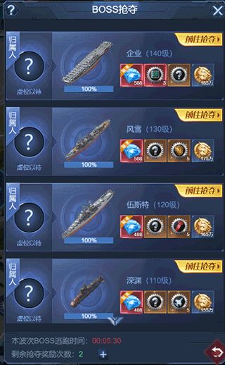 每周三、五12-20点开启,活动开启时,战舰BOSS为一级,击杀当前BOSS会刷新下一等级的BOSS,包括下次活动开启,BOSS将按照上次等级刷出,活动开启当天有10次挑战机会,可通过钻石购买更多机会。该玩法可获得大量碳化钢、红装、金装精华、金币。可用于装备商店购买装备。