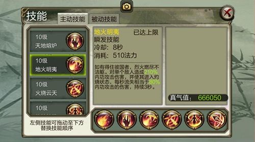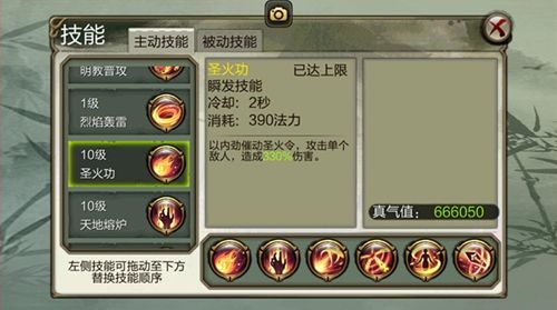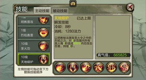 对6步范围内所有的敌人造成高比例持续伤害。明教唯一范围伤害技能,超高持续输出,副本、世界首领、挂机非常方便。但由于该技能需要施法读条,可以自行取消,也很容易被打断。在打架时可在对方控制或打断类技能释放结束后使用。技能等级越高伤害加成越高,前期推荐升级该技能。