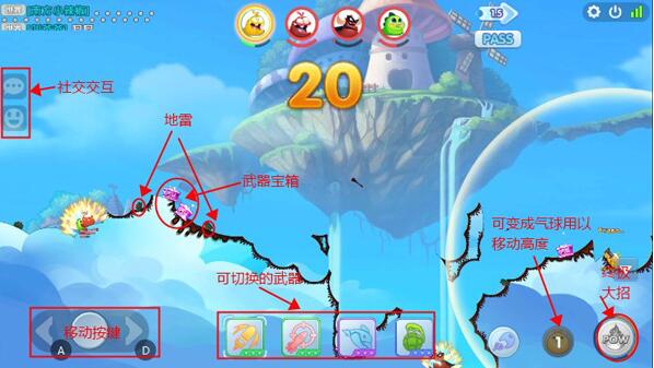 其次游戏中威力爆炸的地雷和不定时刷新的武器宝箱,利用角度借助地雷来将伤害最大化,同时在你回合期间,你可以随时移动变换位置,获取武器宝箱,或者是寻找掩体,亦或者找到攻击对方的角度。