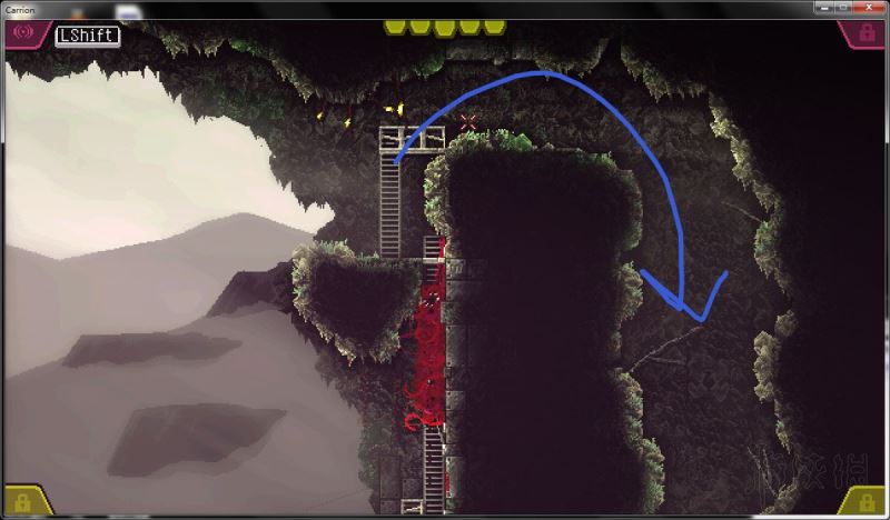 4、通过打开的路径进入下方房间,降落在管道旁的水中;前往该房间左侧,下到更下方的矿井房间。
