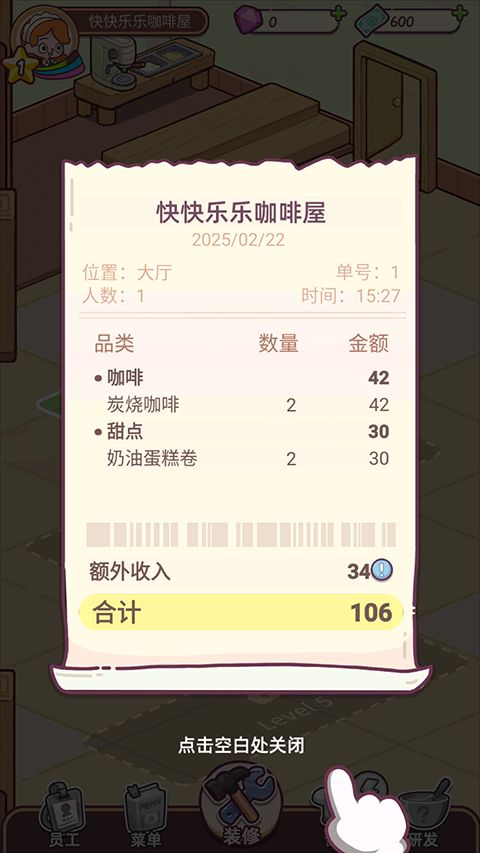 为你的顾客提供咖啡、蛋糕、甜品、三明治等一系列美食。玩的越多,就能制作越多种类的菜品!