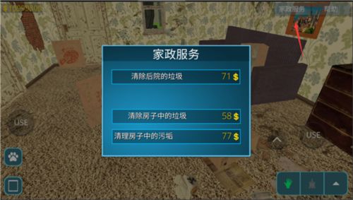 2、成功进入房间,点击右下角的这个图标可以使用道具来打扫垃圾;
