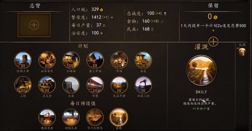 食物不多的情况下选择灌溉提升食物的产量,之后选训练民兵提升数量。