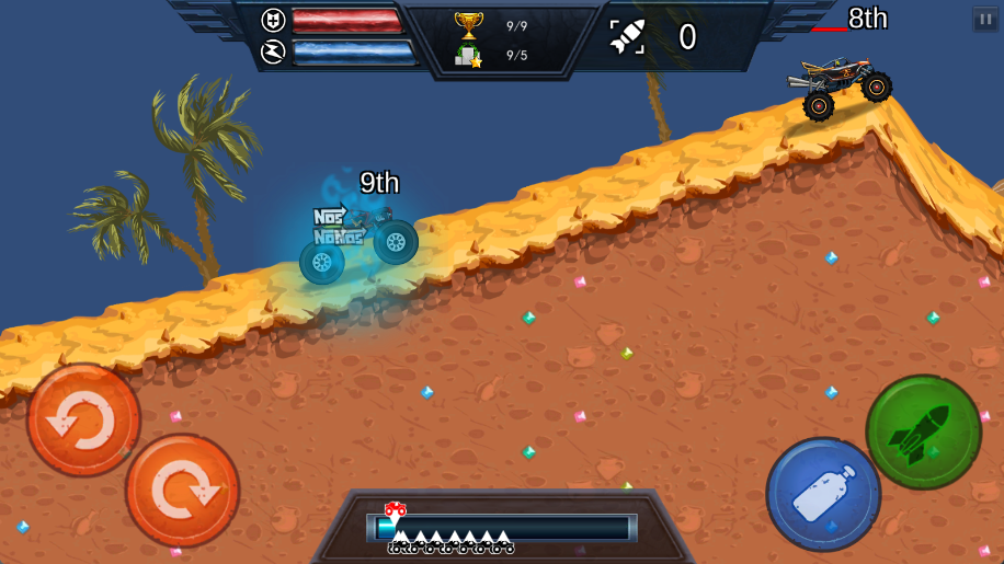 发射导弹攻击前方的对手,使他们失去控制,或者在赛道上埋下地雷,让后面的追兵猝不及防。