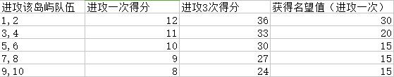 3、而这10个岛屿分为5组,攻打他们会获得不同的名望值和积分。