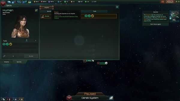 种族:这里显示出你的帝国的平民,在这里可以查看到人口的数量以及查看全星系的物种分布。