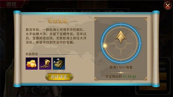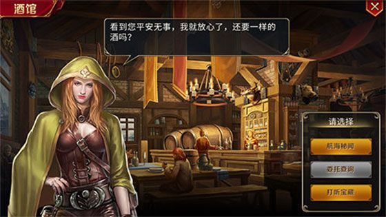 在航海世界里的各个著名港口中,都存在着一个信息交流站——酒馆,航海家们可以在酒馆中向酒保打听关于热卖航线的消息;可以接取委托任务;还可以打听关于航海密藏的消息。在与酒保闲聊的过程中,打听关于宝藏的秘密,有机会可以获得藏宝图,开启海上寻宝之旅。