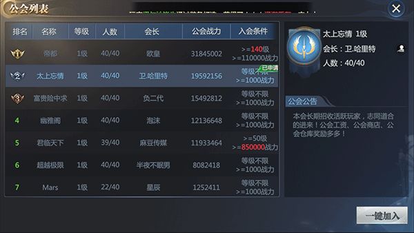 在列表界面,我们可以看到同区的其他帮会情况,了解对方的状况!知己知彼百战不殆。