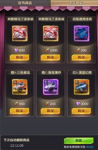 通过赛车币礼物获取的涂装卷,可以用于在座驾商店购买指定涂装,同样也可以直接花费钻石购买,这里推荐把钻石花费在这里而不是其他地方,每天免费刷新次数极多,能更加稳定获取想要的涂装,很快就能凑出一台座驾的涂装新外观。