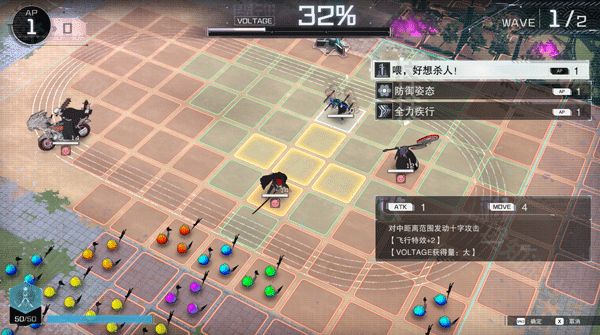 进入战斗选中玩家会出现总四个颜色的方格,绿色是可移动范围,红色是可攻击区域,黄色是技能覆盖范围,灰色则是不可移动区域。