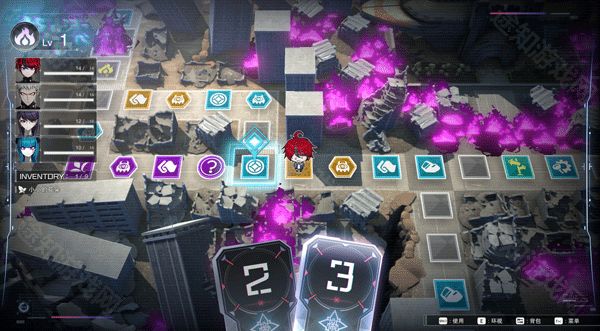 四名角色成对行动,踏上格子后,随机抽取卡牌点数,根据卡面的点数来向前推进。由于角色的移动是可控的,你可以自由选择行走方向。每个不同的格子对应着不同的随机事件或战斗,完成后将获得相应的资源,这些资源可以转化为升级材料。