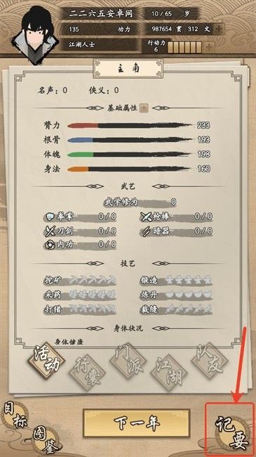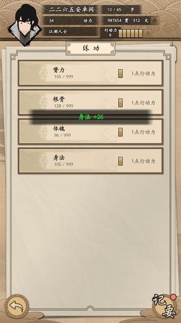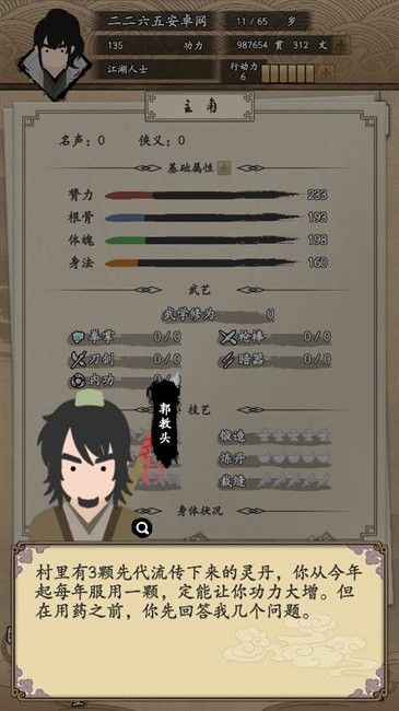 属性分配:根骨、悟性、臂力等属性影响武学修炼速度与战斗风格。
